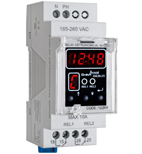 ساعت نجومی دو رله ای شیوا امواج بدون نیاز به دریافت نور در هر روز سال با یک برنامه میکروپروسسوری می تواند طلوع و غروب را به صورت دقیق تشخیص داده و سیستم روشنایی را با دو خروجی کنترل نماید. ساعت نجومی فاقد سنسور چشم می باشد و در هر محل سرپوشیده، قابلیت نصب دارد.دو رله خروجی دستگاه مستقل از هم بوده و تنظیمات تأخیر یا تقدم در روشن و خاموش بودن به صورت جداگانه برای هر یک تنظیم می گردد.